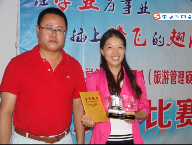 经过由学院领导、教师组成的评选委员会成员们的认真评选,最终诞生了一等奖一名、二等奖两名、三等奖三名,并于2014年10月3日下午举行了颁奖仪式,广西师范大学历史文化与旅游学院党委副书记李闰华、学院副教授农朝幸、吴晓山分别为获奖学生颁奖。