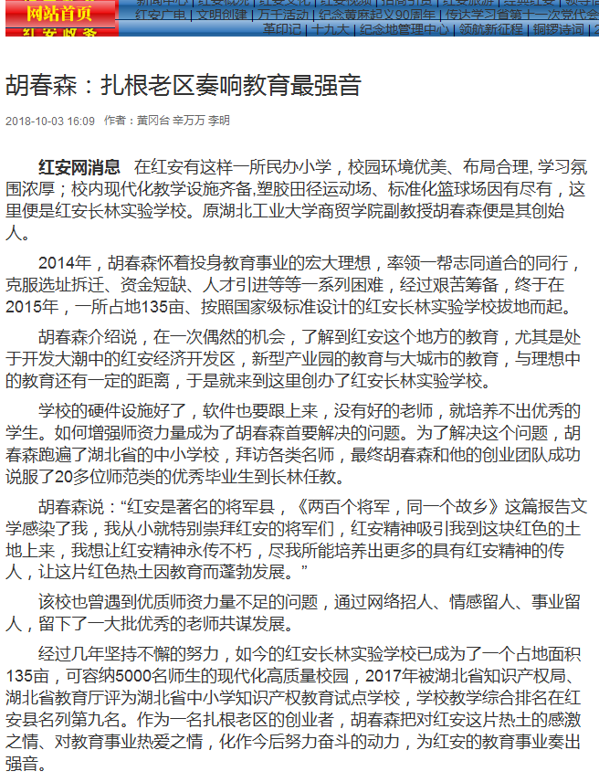 胡春森介绍说,在一次偶然的机会,了解到红安这个地方的教育,尤其是处于开发大潮中的红安经济开发区,新型产业园的教育与大城市的教育,与理想中的教育还有一定的距离,于是就来到这里创办了红安长林实验学校。