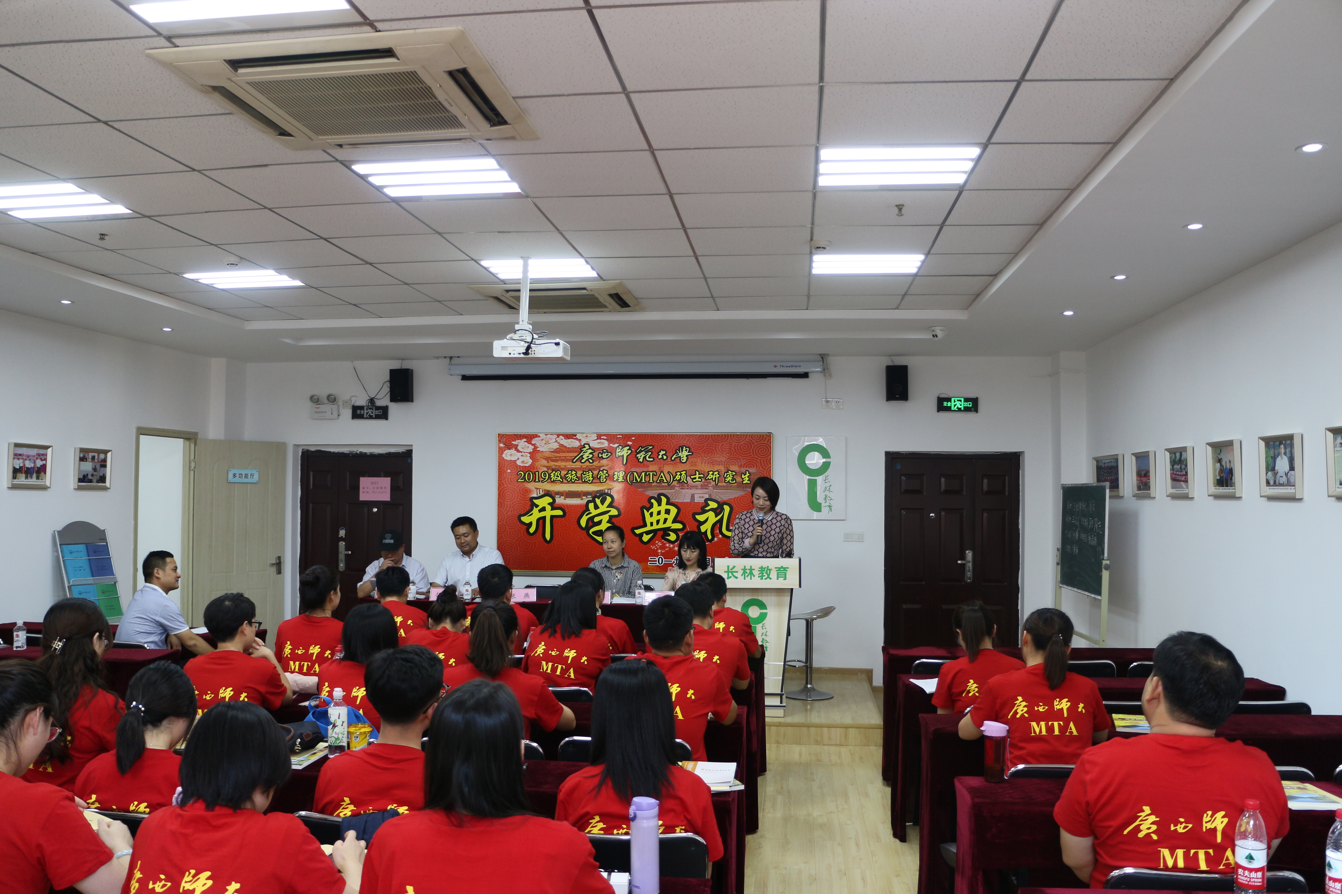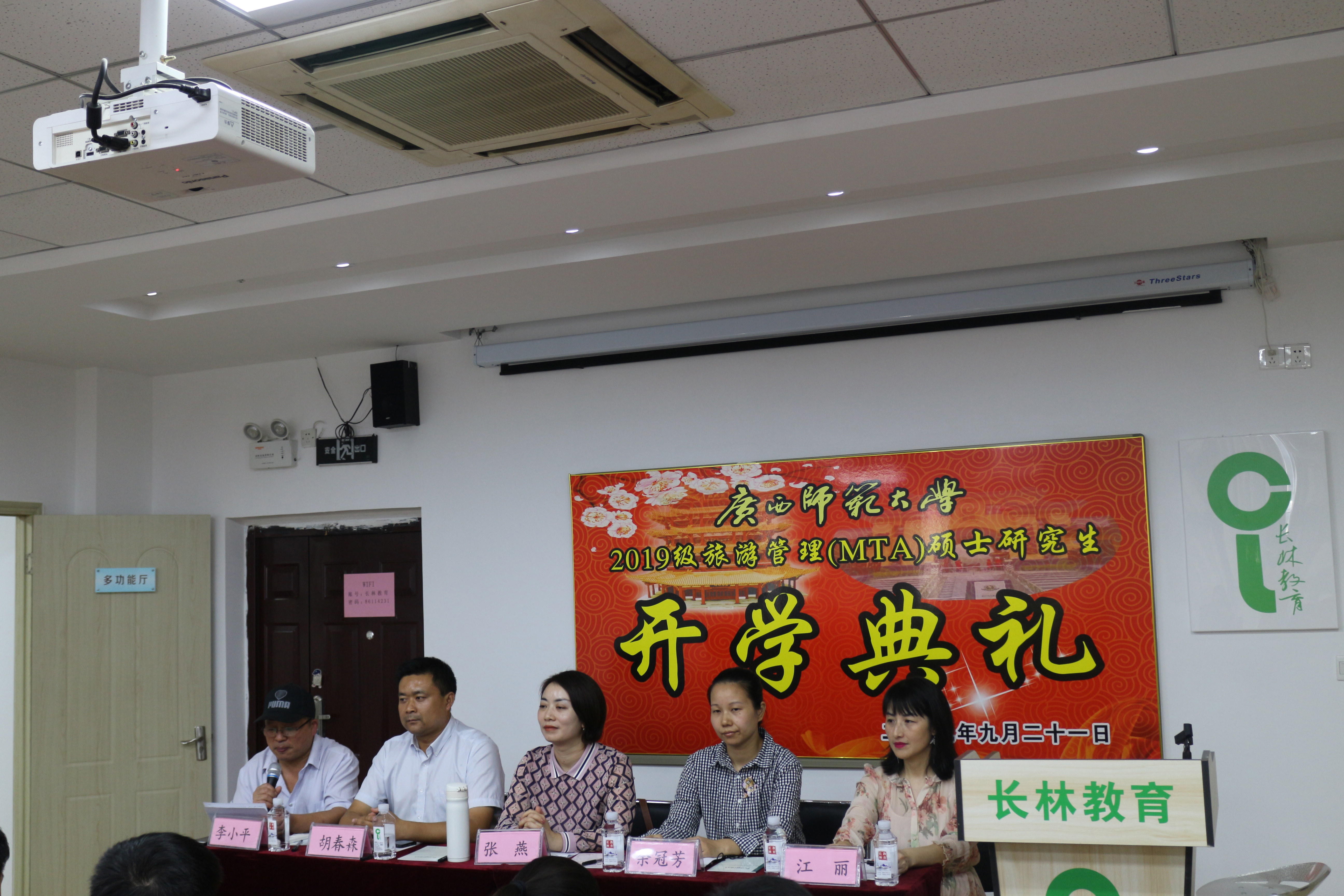 2019年9月21日下午,广西师范大学2019级旅游管理硕士研究生(武汉)开学典礼在湖北长林信息工程研究院举行。广西师范大学MTA教育中心主任张燕教授、湖北长林信息工程研究院院长余冠芳教授、武汉长林教育董事长胡春森教授,学院相关教学管理人员、2019级研究生新生出席了开学典礼。