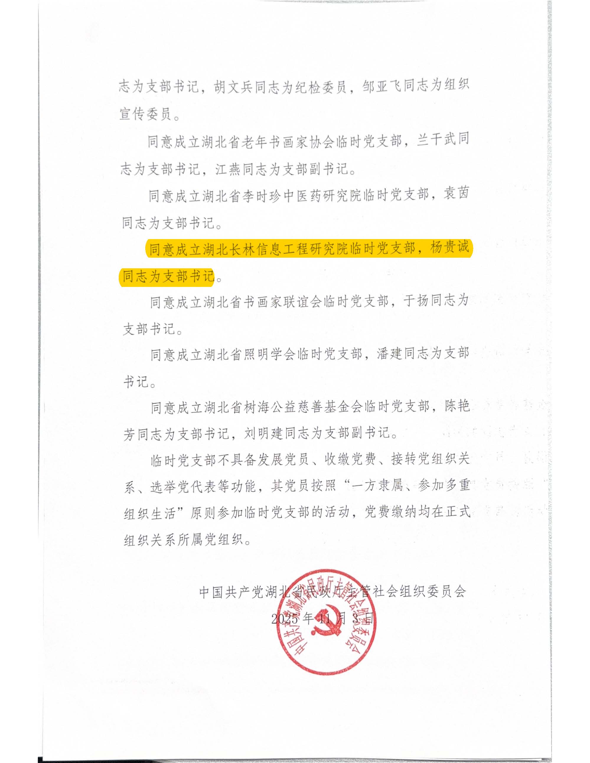 鄂民社党【2025】5号,经上级党组织批准,湖北长林信息工程研究院临时党支部正式成立,标志着该院党建工作迈出关键一步,为企业高质量发展注入红色动力。